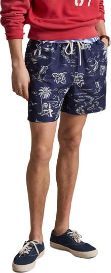 Lightweight, quick-drying fabric keeps you comfortable in and out of the water in swim trunks equipped with a secure back pocket for on-land essentials. Ralph Lauren's embroidered polo rider—iconic since its 1971 debut—hints at preppy heritage.