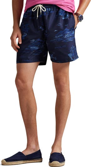 A Polo-original print underscores the vacay vibe of these classic swim trunks ready for some sun and surf.