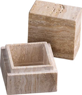 Conceal your smallest treasures in plain sight with this hand-carved travertine box. With its clean lines and smooth, cube silhouette, it brings quiet structure to any surface. The natural veining and subtle texture of travertine make each piece uniquely expressive—perfect for storing incense, matches, jewelry, or other small essentials.