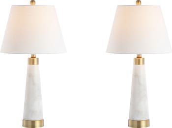 This modern column lamp adds a low-key touch of glamor to contemporary or traditional rooms. The solid marble base is accented with brass-gold banding and gold finial. The LED bulb is bright enough for reading, and shaded by a classic tapered lampshade.