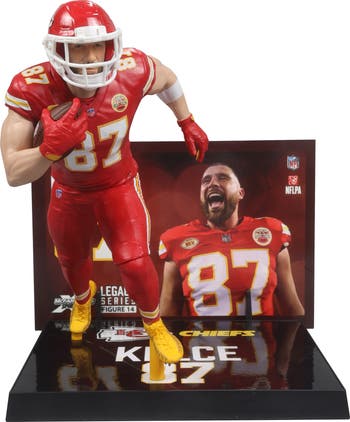 Travis Kelce (Kansas City Chiefs) NFL 7" Figure McFarlane's SportsPicks. Travis Kelce was selected by the Chiefs in the third round of the 2013 NFL draft. He is considered one of the greatest tight ends of all time. Kelce is a nine-time Pro Bowler and a seven-time All-Pro, holds the NFL records for most consecutive and most overall seasons with 1,000 receiving yards by a tight end, holds the record for most receiving yards by a tight end in a single season, and became the fifth NFL tight end to reach 10,000 career receiving yards. Kelce made four Super Bowl appearance in five seasons, helping the Chiefs win Super Bowls LIV, LVII, and LVIII. McFarlane's SportsPicks NFL Legacy Series Figure #14. Officially licensed by the NFL and NFLPA. Incredibly detailed 7" scale posed figure. Includes a backdrop. Comes with a base with team logo insert.