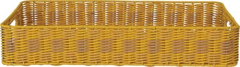 - A sun-kissed rectangular woven tray in warm yellow and tan tones, detailed with integrated side handles