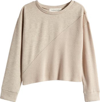 A diagonal division contrasts a heathery knit with waffle texture in this lightweight and cozy sweatshirt.
