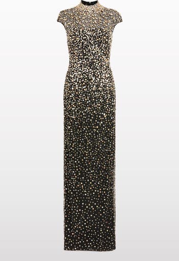 Radiating refined glamour, this gown features a high neckline and delicate cap sleeves for a sophisticated finish. Intricately adorned from bodice to hem, it follows the bodys contours before falling into a sleek, column silhouette. A striking choice for evening receptions or black-tie occasions.