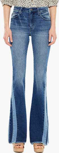 Show off your style with this pair of Treasure flare jeans with silhouette-enhancing medium-washed flare jeans crafted from soft denim, featuring light whiskering, fading, subtle distressed detailing on the front and back pockets. These flares come with the classic 5-pocket design and single button closure. With a piecing detail at the side bottom, this style is perfect for adding a flare to any outfit.