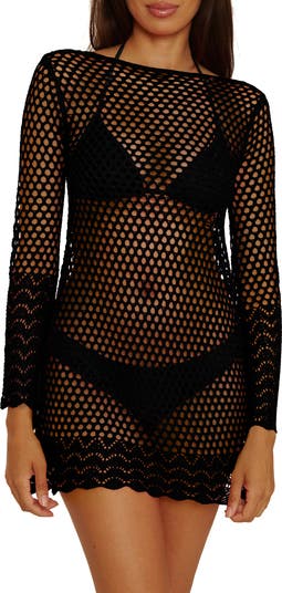 Crochet-inspired openwork stitches make this cover-up tunic sheer and breezy. The lace-up silhouette is reversible and can be worn with the ties at the neck or back.