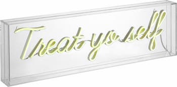 Bright neon makes a whimsical addition to your bookshelf or gallery wall. Use our Treat Yourself sign in the kitchen, or as inspiring bathroom wall art. Convenient, low-voltage USB power is perfect for a bedroom or dorm room.