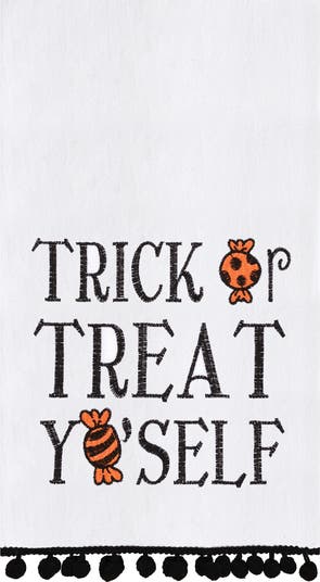 Treat Yo'self Halloween Embroidered Cotton Flour Sack Kitchen Towel With Pom Poms Decor Decoration Decor
