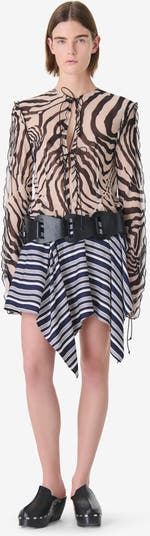 Exude an air of untamed elegance with the Trecy Top, a captivating fusion of bold animal print and delicate, avant-garde construction. This sheer, zebra-patterned blouse features a daring open-front design secured by thin, tonal ties, creating a provocative yet sophisticated silhouette that moves with effortless grace. With its elongated sleeves and raw, ruffled edges, the Trecy is a statement piece designed for those who embrace fashion as a form of art.