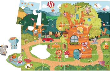 Step into a glow-in-the-dark tree house world with this story puzzle that blends roleplay, early learning, and premium design. Build the puzzle to reveal a vibrant garden party scene by day and a magical glow-in-the-dark scene by night. Wooden figurines bring the puzzle landscape to life for imaginative play. It’s designed to combine with our other Story Puzzles, so little builders can create an even larger connected world. This set supports fine motor skills, problem-solving, shape recognition, and spatial awareness. Comes in a high-quality reusable box with a beautifully illustrated interior to extend storytelling and play. Designed in Europe, the Bababoo and friends® Tree House Garden Party Activity Story Puzzle is crafted from high-grade blue-edge cardboard for durability and lasting play.