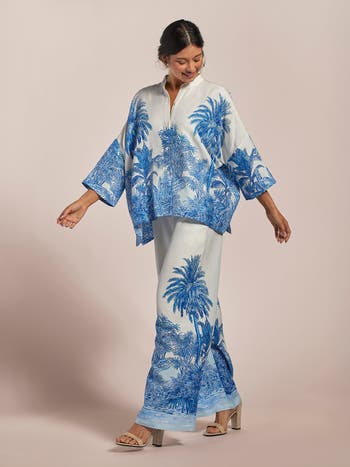 Koa, hala, coconut palms—Hawaii's many diverse trees add depth and character to the landscape as they stand against the sky. Vacation style should feel effortless. The Emi Pant features a wide leg silhouette and easy pull-on styling. Front pleats add a smooth, tailored finish. Woven in a wrinkle-resistant linen-viscose blend.