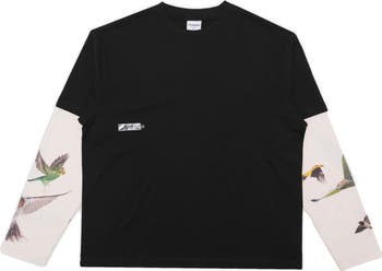 Birds take flight along the long sleeves of this graphic T-shirt cut from soft, breathable cotton to look like two layers with the ease of one.