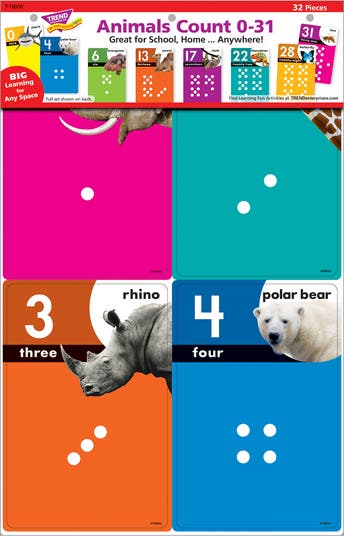 Count to 31 with animal fun! Reinforce early math and surround kids with educational, engaging decorations with this Learning Set. The vibrant colors and animal photos keep kids interested and excited to learn numbers. There are endless ways to display and sort to build displays, support lessons, and make learning FUN. Large photos and vibrant colors make Animals Count 0-31 Learning Set a perfect way to decorate at school, in childcare centers, as well as home spaces like playrooms, reading corners, and kids' bedrooms.32 punch-out pieces in the set, showing numbers 0 through 31, meauring 5-1/4" x 8" (13.3 cm x 20.3 cm) each.