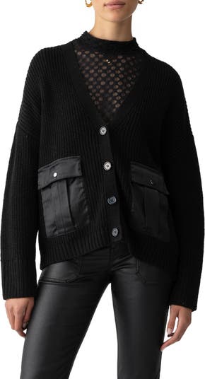 Satin cargo pockets add some on-trend style to this cozy, relaxed-fit cardigan knit with dropped shoulders and a V-neckline.