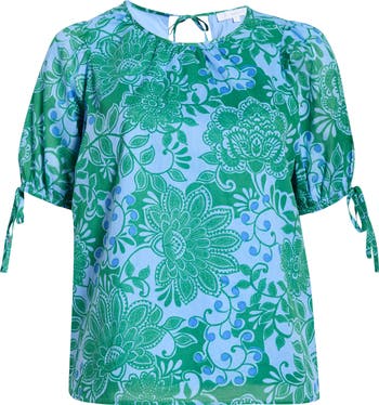 Bold and colorful, this floral-print cotton top is detailed with gentle shirring at the crew neckline for subtle texture. Short puff sleeves finish with delicate ties at the elastic cuffs, adding a playful touch to the breezy silhouette.