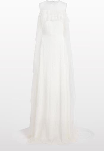 This designer bridal gown exudes ethereal sophistication with its off-shoulder neckline and cascading layered cape sleeves. The fluid silhouette is adorned with delicate embellishment that subtly illuminates the fabric, creating an understated shimmer in motion. Combining modern artistry with timeless grace, this luxury wedding dress embodies refined elegance and effortless romance.