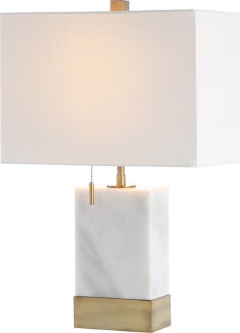 This modern console lamp is only 8" deep, for a low-key touch of glamor that fits almost anywhere. The solid marble base is accented with brass-gold banding and a stylish pull-chain switch. The LED bulb is shaded by a contemporary rectangular lampshade.