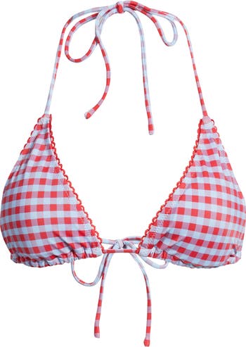 Triangle cups and adjustable ties define this lace-trimmed bikini top cut from a stretchy, quick-drying fabric.