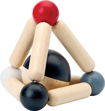Made of rubber wood and colored with organic pigments, this triangular-shaped toy with a removable rattle ball encourages development of fine motor skills as your kiddo grasps it.