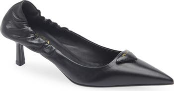 A pointy toe and sculptural heel frame this calfskin pump designed in a softly ruched silhouette finished with a puffy take on Prada's iconic triangle logo.