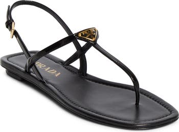 Glossy patent-leather straps elegantly wrap the foot in this minimalist Italian-crafted sandal finished with Prada's iconic triangle logo in gilded enamel.