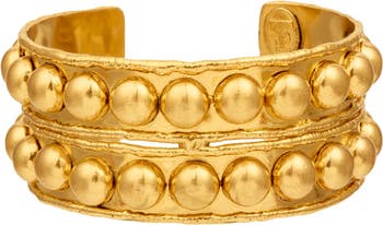 Gold plated brass cuff "Tribal" -Chic and structured, this gold cuff features two bold rows of polished domes framed by textured edges. A sophisticated blend of symmetry and shine, perfect for everyday elegance or statement styling.