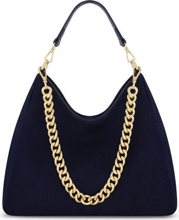 - Crafted from luxe denim with a sleek, sculptural silhouette accented by a bold gold chain for instant edge and elegance.