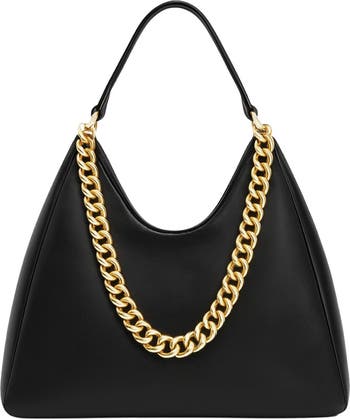 - Crafted with a sleek, sculptural silhouette accented by a bold gold chain detail for instant edge and elegance.
