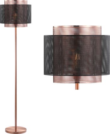 This modern metal floor lamp combines two finishes, copper and blackened metal, to stunning effect. Layered mesh drums allow enough light through to give a subtle glow, illuminating but not overpowering your space. The ideal height for beside a chair or sofa, we love utilizing this floor lamp for a home office or living space.