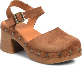 Aged-finish midsole studs amplify the retro appeal of a supple suede clog lifted by a woodgrain platform and block heel. A cushioned footbed and adjustable buckle closure deliver a comfortable and secure fit.