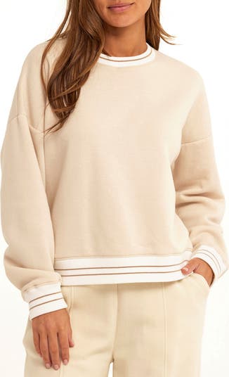 Dropped shoulders further the relaxed fit of this sweatshirt with varsity-inspired ribbed trim that highlights the cozy triblend fleece.