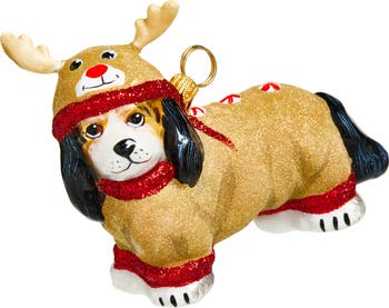 Outfitted for the season in a glitter-dusted reindeer costume, this hand-painted glass ornament is the perfect way to pupdate your holiday decor.