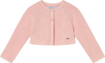 A cozy and charming layer designed with subtle detailing, perfect for keeping little ones comfortable while adding a touch of style. Its soft finish makes it suitable for everyday wear or special outings. Long sleeves with a round neckline for classic appeal. Front button closure with decorative knit accents along the placket.