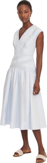 Blue tone sleeveless dress in a midi silhouette featuring a V-neckline, trim detailing and a zip fastening through the back.