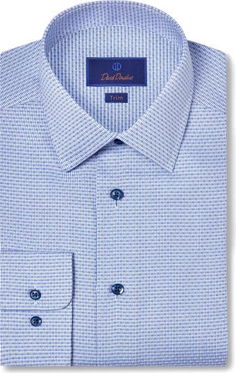 Subtly textured cotton dobby patterned in ombré geometries brings elevated detailing to a dress shirt designed with a simple French placket for a smart, streamlined look. Crafted with dark buttons and a midweight feel, it makes a versatile, all-season addition to your semiformal wardrobe.