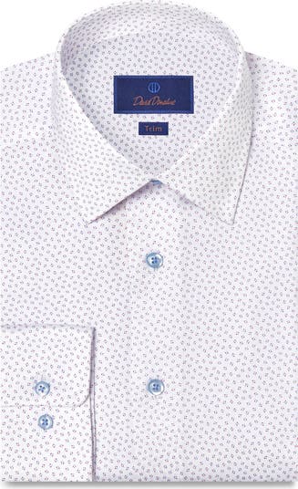 Subtly textured cotton patterned in a stylized geometric print brings elevated detailing to a dress shirt designed with a simple French placket for a smart, streamlined look. Crafted with lustrous buttons and a midweight feel, it makes a versatile, all-season addition to your semiformal wardrobe.