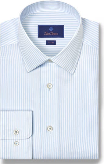 A blend of cotton and silk patterned in stripes of sky blue and cloudy white brings polish and texture to a dress shirt designed with a simple French placket for a smart, streamlined look. Crafted with tonal buttons and a midweight feel, it makes a versatile, all-season addition to your semiformal wardrobe.