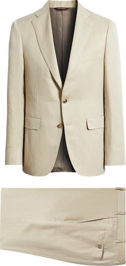 Perfect for sunny-day occasions, this wardrobe-staple tan suit tailored from a blend of linen and silk features a jacket with softly constructed shoulders for a smart profile that allows for room to move. The flat-front trousers sit above the hips in a modern silhouette that looks crisp and clean in any setting.