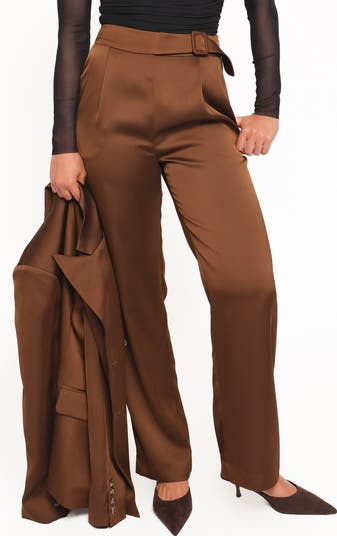 Drapey straight legs enhance the polished silhouette of these belted pants elevated in glossy satin.