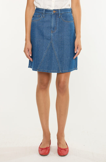 In a mid-length we have our new Trina High Rise Skirt. Composed from Lurex fabric making this style a beautiful medium dark color with gold details weaved in. Gusset details throughout that add on to the beautiful styling of the skirt. Ending right at the knee this style offers a beautiful slim fit. Classic single button and zip fly closure, 5 pocket style with no distress details.