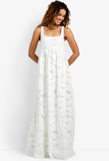 Summer soirees, celebrations, and outdoor parties are better in this beautiful, sleeveless maxi dress. It features a square neck, center back invisible zip, and empire waist for a flirty yet sophisticated look. This maxi dress is made of light and airy laser-cut cotton with a large all-over floral motif.