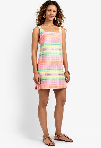 For get-togethers with friends or an island getaway, a colorful print is just what you need for your summer wardrobe. This sleeveless shift dress has a mini length, square neck, and center back invisible zip. It is made of multicolored, striped jacquard intricately woven with gold Lurex for a playful twist.