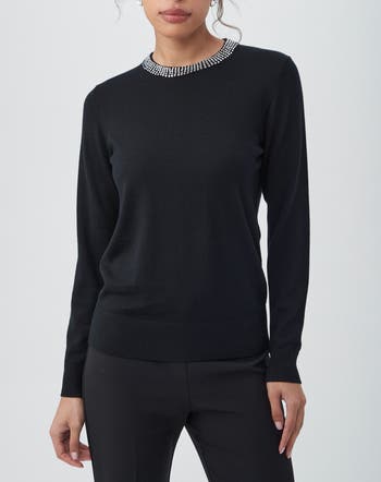 Sheer merino wool crewneck sweater with rhinestone trim along the neckline