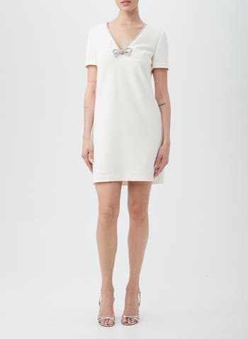 Short sleeve shift dress with rhinestone trim along the neck and rhinestone bow