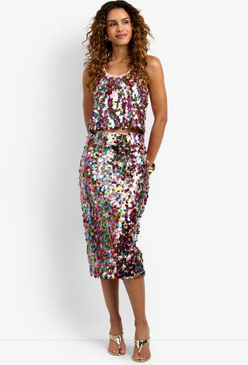 Covered in high-shine, teardrop-shaped, rainbow ombré paillettes, this skirt really brings the party. This midi skirt is finished with a center back invisible zip.