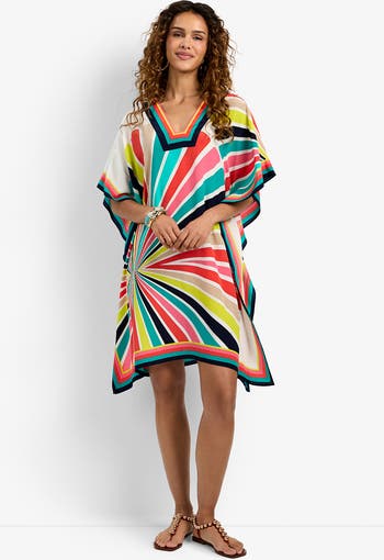 Our top-rated caftan dress is back in a colorful, retro-inspired print. In luxurious silk crepe de chine, this short caftan dress is ideal for a romantic dinner under the stars or as a chic swim cover-up for poolside cocktails on your next holiday in the sun.
