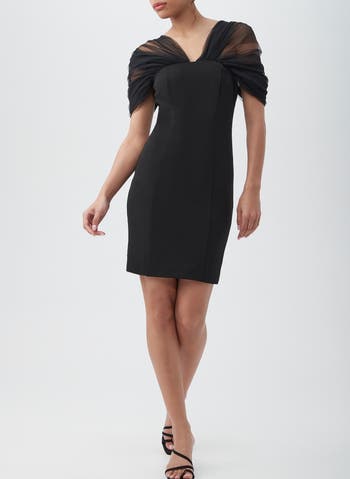 Crepe knit sheath dress with gathered tulle sleeves and square back