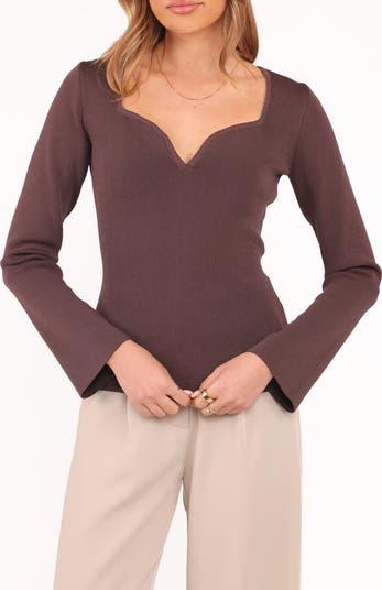 A beguiling sweetheart neckline elevates a trim-fitting knit top textured by narrow ribbing.