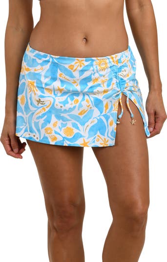 Cinched ties make these ruched bikini bottoms look like a sassy short skirt that's perfect for a stroll along the shore.