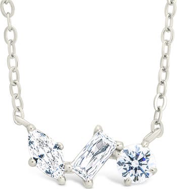 A trio of cubic zirconia done in an assortment of cuts and set slightly askew bring geometric flair to a delicate chain necklace designed to shimmer against any look.